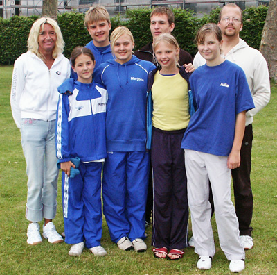 Erstmals ging es zu den BZM ins Freibad nach Münster. Dort angekommen (geparkt wurde übrigens auf dem Parkplatz der anliegenden niederländischen Kaserne, weswegen wir vor dem militärischen Bereich bereits alles ausräumen mussten, da nur der Fahrer Zugang hatte) ging es natürlich zügig ans Einschwimmen – und wir Trainer machten erst einmal lange Gesichter. Der Zugang zum Becken war auf einer Seite doch tatsächlich nur in Badelatschen oder barfuß möglich. Na ja, man kann es ja übertreiben...