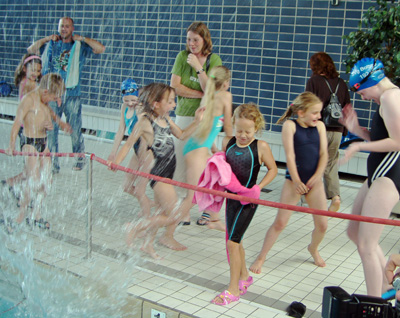 Klar, dass sie ganze Truppe immer komplett am Beckenrand steht. Zuerst knapp, dann souverän werden die Brust-, Rücken- und Kraul-Staffel gewonnen, auch sämtliche Punkte im Koordinationsschwimmen fahren wir ein.