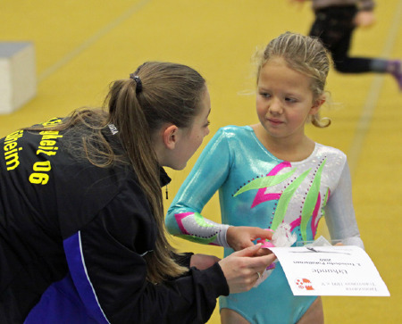 Das erste Mal ging es für Jil mit eigenen Küren in den Wettkampf. Insbesondere bei der Bodenübung hatten Clara und Antje Kreativarbeit geleistet, hatte Jil sich doch ihre eigene Musik ausgesucht.