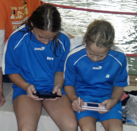 Jil geht über 100 m Schmetter-ling ins Rennen und wird hier mit einer guten Zeit Siebte. Danach kann sie sich anderen Freizeitak-tivitäten widmen, denn sie muss heute nicht mehr ins Wasser.