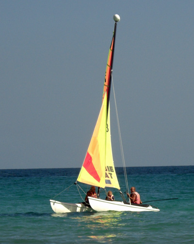 Endlich konnten wir am Strand dann auch unserer neuen Leidenschaft seit dem letzten Urlaub nachgehen: Kat-Segeln. Immer ging es nun morgens an die Nautik, um einen Kat zu reservieren.