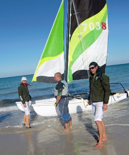 Aber im Wasser bekam er dann einen der-artigen Lachanfall, dass Jil, die gerade eigentlich zu zetern anfangen wollte, glatt mitlachen musste. Na ja, waren wir halt ein bisschen nass geworden. Zur Strafe musste Marc dann hinterher alle Segelsachen alleine ausspülen, denn Jil wollte sich möglichst schnell wieder aufwärmen.
