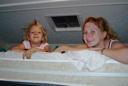 Beim Zusammentragen der heutigen Ereignisse fiel Michelle dann das deutsche Wort für „umbrella“ nicht ein. Wollte sie jetzt auch noch Sandra Konkurrenz machen? Als sie dann jedoch das Ganze dann den Anderen vorlesen wollte, bekam sie einen Lachanfall nach dem anderen. Etwas später bekam sie jedoch plötzlich Angst. Sandra und Gritta waren gerade zum Zähneputzen, als sie plötzlich irgendwelche Tierchen vor unserem Camper entdeckte. Ohnehin war es ihr zu duster, als dass sie sich dazu bewegen ließ, ebenfalls noch einmal die Waschräume aufzusuchen. Zähneputzen im Camper war angesagt. Aber kein Wunder, dass da Tiere herumschwirrten. Es waren wohl ein paar Waschbären, die sich die Reste von Michelles Abendessen schnappten, die diese ja nicht aufgesammelt hatte.