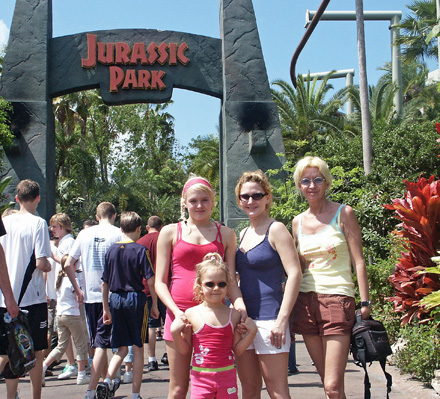 Dafür beschwerte sich Jil bei Earthquake, dass es ihr zu kurz war. Unterwegs bekamen wir heute übigens den ersten Regenguss während unseres Aufenthalts in Orlando ab. Die Gelegenheit nutzten wir zur „Flucht“ in Terminator 2, wobei Michelle schon wieder kniff. Zum Glück war es nur ein Guss, so dass es nach kurzer Zeit schon wieder schön war. Kurioses gab es bei E.T.. Da dieser jeden Besucher persönlich verabschiedet, muss man natürlich den Vornamen angeben. Tja, und Marjona war leider nicht in der Lage, ihren Namen zu buchstabieren. Sandra konnte es – wenigstens etwas Englisch (!) -, hätte ihn aber einfach nur etwas amerikanischer aussprechen müssen.