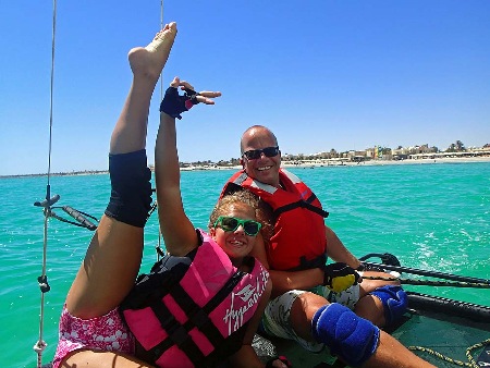 Später sind Jil und Marc mal wieder segeln. Zwar ist heute kaum Wind, dafür aber reichlich Welle. Und eine davon trifft Jil voll ins Auge. Und damit nicht genug. Eine Halse fährt Marc derart ungeschickt, dass Jil beinahe vom Cat purzelt.