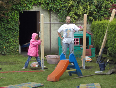 Am Nachmittag kommt Hans-Georg vorbei, um Jils neue Reckstange (ihr großer Wunsch von Mami und Papi zur Kommunion) im Garten einzubetonieren.