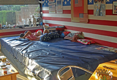 Die Gründe für unsere Wohnzimmerrenovierung verlassen heute Abend Selbiges bzw. kommen hinein, sprich unsere Couch fliegt auf die Straße (morgen ist Sperrmüll) und die große Turnmatte nimmt jetzt als "Liegewiese" den Großteil des Platzes in Anspruch. Der Anblick ist sicherlich gewöhnungsbedürftig, aber es hat was... (vor allen Dingen ist es super-bequem).