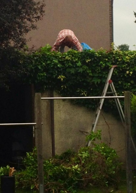 Da Marc sich für den späteren Nachmittag wieder zum Renovieren angesagt hat, wird heute also direkt nach der Rückkehr gegrillt. Später amüsiert er sich dann drei Stunden damit, alte Farbe von der Treppe zu kratzen. Und zum Abschluss klettert er dann zu Hause aufs Garagendach zum Efeu schneiden.