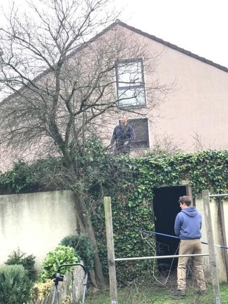Am Nachmittag wird das Teil dann aufgebaut. Marc wird noch etwas länger daran erinnert werden, weil er es schafft, einen fest-sitzenden alten Zaunpfahl so herauszuwuchten, dass er sich die Kante mit Wucht in die Rippen rammt.